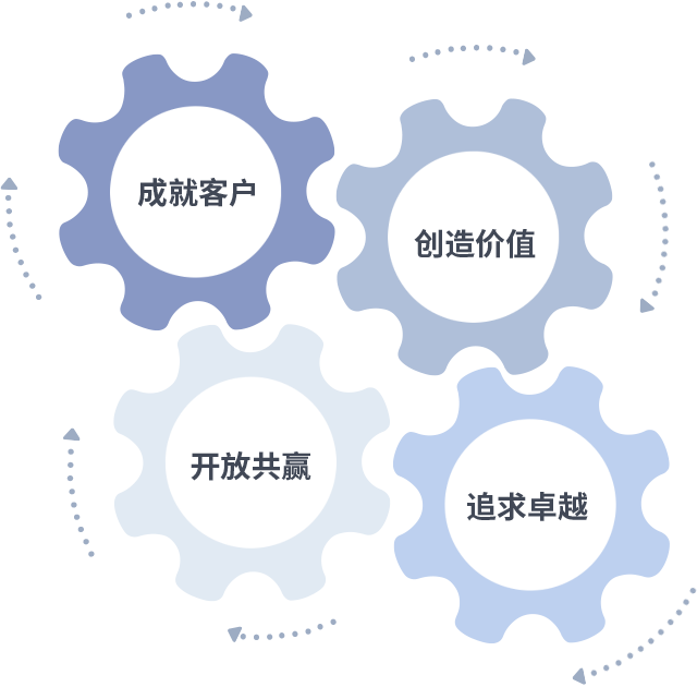成就客户是一切决策的出发点,,,,创造价值是衡量所有工作的标准,,追求卓越是我们做事做人的态度,,,,开放共赢是我们的格局也是最终的结果。。。。价值观的齿轮环环相扣,,,推动着组织里的每个人不断向前。。。。